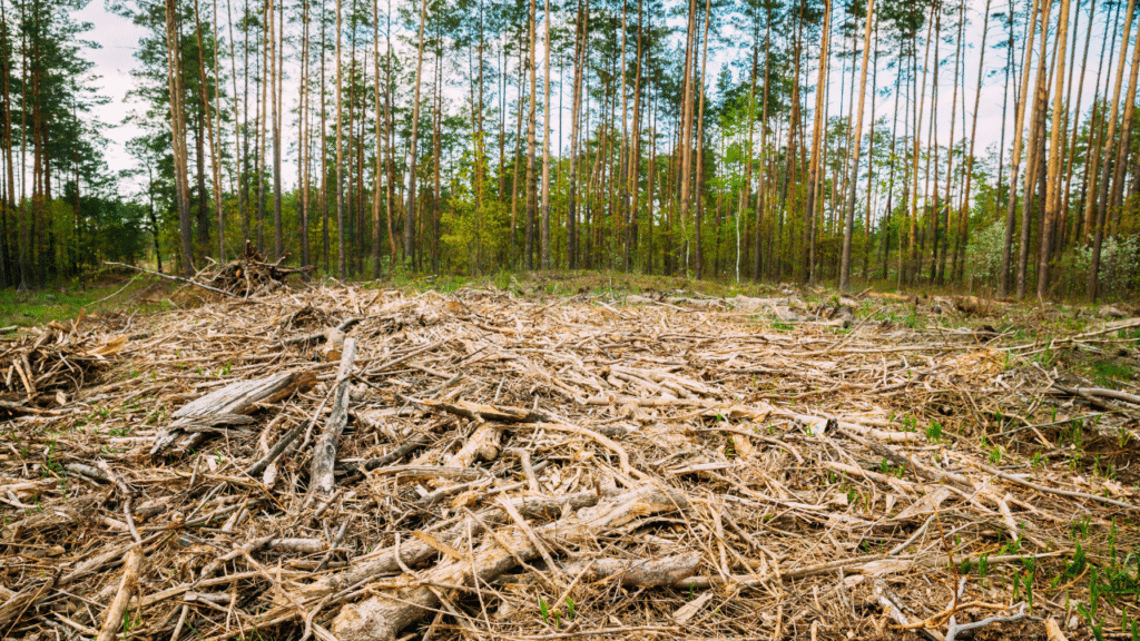 Fewer trees → less CO₂ absorption → increased atmospheric CO₂ → enhanced greenhouse effect → climate change → shifts in species distributions. Humans act as major plot influencers.