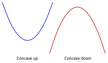 The second derivative ($f”(x)$) tells us about the “shape” of a graph—whether it is concave up (like a cup) or concave down (like a cap).