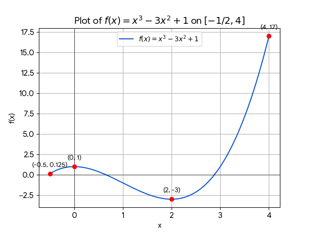 - Endpoint x = -0.5: f(-0.5) = (-0.5)3 – 3(-0.5)2 + 1 = -0.125 – 0.75 + 1 = 0.125