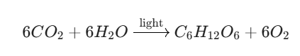 Plants take carbon dioxide and water to create glucose and oxygen. The equation describes this complex biological process in one clean line:
