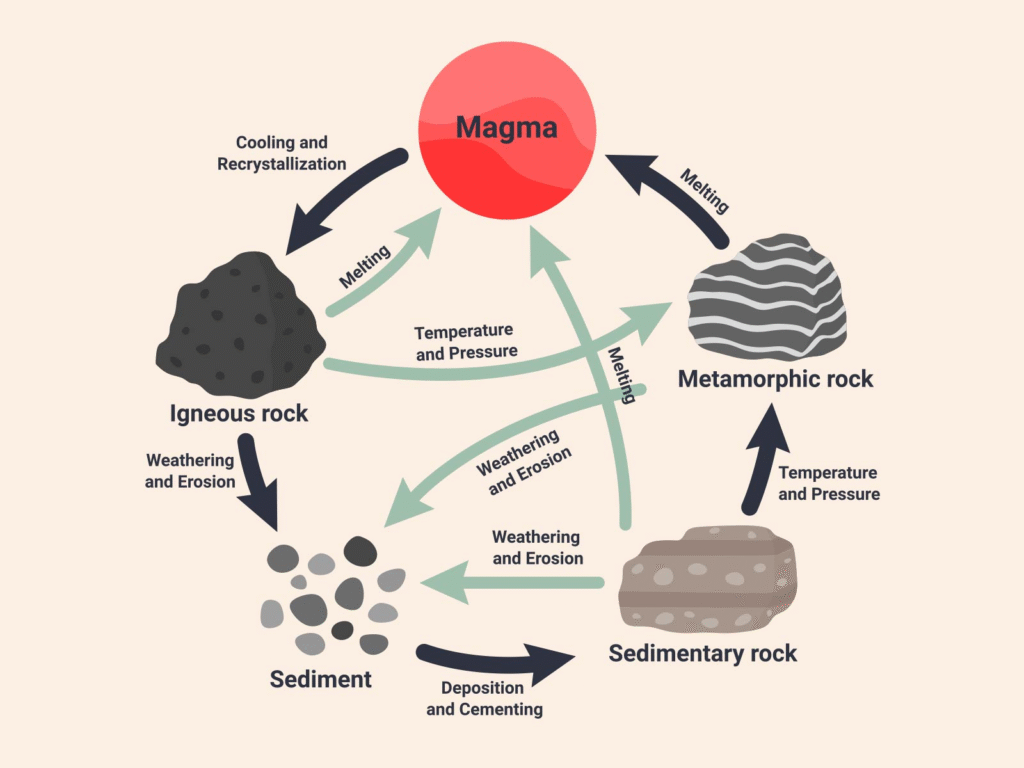 • Earth’s Internal Heat: Powers plate tectonics, which creates the heat and pressure for metamorphism and the melting required for igneous rocks.