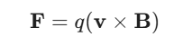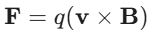 The force F exerted on a charge $q$ moving with velocity v in a magnetic field B is given by: