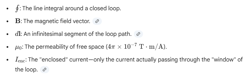 To use Ampere’s Law, physicists imagine an invisible closed path—called an Amperian Loop—surrounding a current. Ampere’s Law states that if you add up (integrate) the magnetic field along that entire path, it will be equal to the total current passing through the loop, multiplied by a constant.